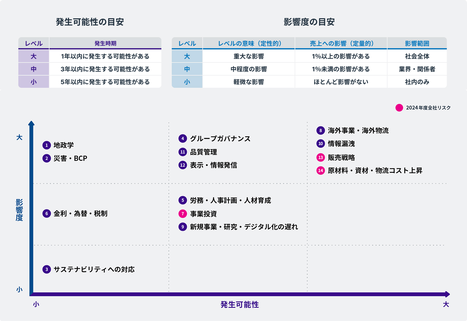 当社は2024年度までに、日本を拠点に13の国と地域への進出を果たし、グローバル戦略を推進してまいりました。こうした展開に伴い、災害や国際情勢の緊張などの地政学リスクが、調達・生産・物流・販売といったグローバルな事業活動に大きな影響を与える可能性が考えられます。サプライチェーンマネジメント、事業継続計画(BCP)、情報セキュリティの観点も踏まえながら、情報の収集・分析・共有と対策について検討を行ってまいります。
