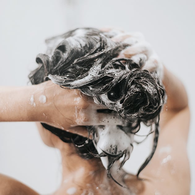 くせ・うねりとダメージにより広がる髪を、根元から洗い上げまとまりのベースをつくります。